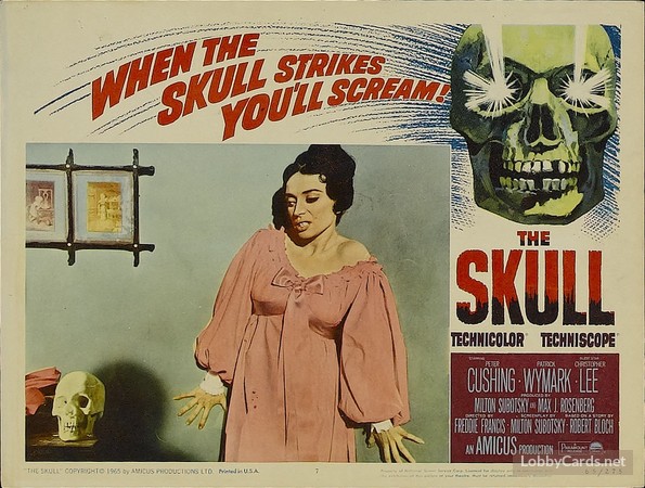 The Skull [from a short story by Robert Bloch, author of Psycho] is a fearsome, finely acted and moody tale of Gothic horror. The 150 year old skull of the Marquis de Sade has been taken from its grave, bringing terror to those who own it. Demonologist Christopher Maitland [Peter Cushing] is eager to add the piece to his occult collection. Despite the warnings of a friend [Christopher Lee], he's got to have it. And does he ever get it.